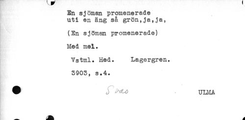 //// En sjöman promenerade //// uti en äng så grön,ja,ja, //// i*' //// (En sjöman promenerade) //// Med mel. //// Vstml. Hed. Lagergren. //// 5903, s.4. //// ^ j ^<9 ULMA ////