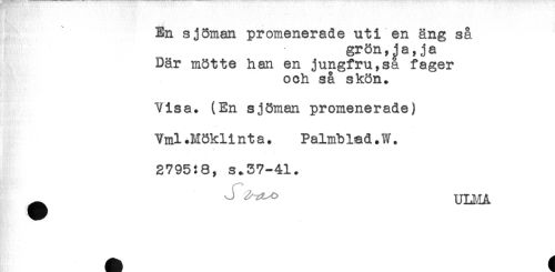 //// En sjöman promenerade uti en äng så //// grön,ja,ja //// Där mötte han en jungfru,sa fager //// och så skön. //// Visa. (En sjöman promenerade) //// Vml.Möklinta. Palmblad.W. //// 2795:8, s.37-41. //// ^ u Act^o ULIvIA ////
