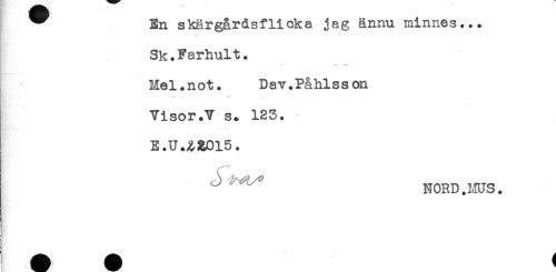 //// ^ En skärgårdsflicka jag ännu minnes... //// Sk.Farhult. //// . //// Mel.not. Dav.Påhlsson //// Visor.V st 123. //// E.U.aa0l5. //// - "NORD.MUS. ////