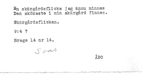 //// En skärgårdsflicka jag ännu minnes //// Den skönaste i min skärgård finnes. //// Skärgårdsflickan. //// 9:4 ? //// Brage 14 nr 14. //// ÅBO ////