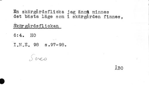 //// En skärgårdsflicka jag änn& minnes //// det bästa läge som i skärgården finnes, //// t //// Skärgårdsflickan //// 6:4. HO //// I.N.E. 98 s.97-98. ////
