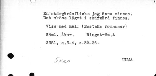 //// En skärgårdsflicka jag ännu minnes. //// Det sköna läget i skäfgård finnes. //// Visa med mel. (Enstaka romanser) //// Sdml. Åker, Ringström,Å //// K ' ^ //// 2381, s.3-4, s.32-36. //// i *. ////