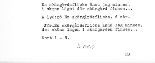 //// Rn sKargarasnicKa annu jag minnes, //// i skona läget där skärgård finnes... //// A 190:35 En skärgårdsflicka. 6 str. //// Jfr.En skärgårdsflicka ännu jag minnes, //// det sköna lägen i skärgården finnes... //// Kort 1-5. ////