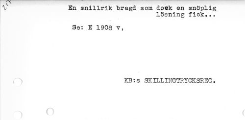 //// 'v En snillrik bragd som douk en snöplig //// lösning fick... //// ' v //// Se: E 1908 v, //// KB:s SKILLINGTRYCKSREG. ////