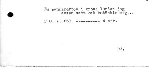 //// En sommarafton i gröna lunden jag //// ^ ensam satt oeh betänkte mig... //// B 8, s. 238. ----- 4 str. //// RA. ////