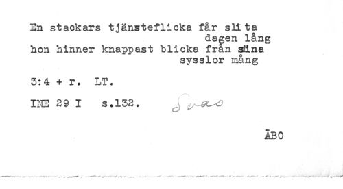 //// En stackars tjänsteflicka far slita //// da^en lång //// hon hinner knappast blicka fran siina //// sysslor mång //// 3:4 + r. LT. //// INE 29 I s.132. _ ^^ //// ÅBO ////