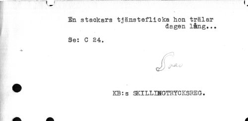 //// En stackars tjänsteflicka hon trälar //// dagen lång... //// Se: C 24. //// ^ KB:s SKILLINGTRYCKSREG. ////