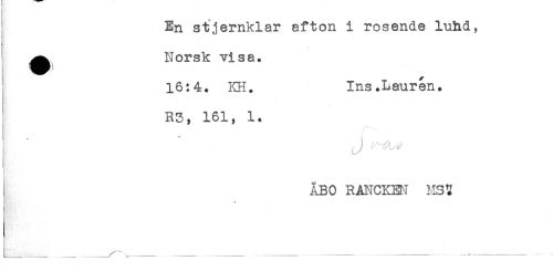 //// En stjernklar afton i rosende luhd, //// <'' .... //// ^ Norsk visa. //// 16:4. KH. Ins.Lauren. //// R3, 161, 1. //// ÅBO RANCKEN MSS ////