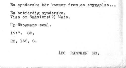 //// En synderska har kommer fram,en styggelse... //// En botfärdig synderska. //// Visa om Småsiens(?) Maja. //// Ur Skogmans saml. //// 19:7. SB, //// R5, 168, 8. //// ÅBO RANCKEN MS. //// ____... . ...- ...._ .-L---. .....I,, '.,___L...-i_! ////