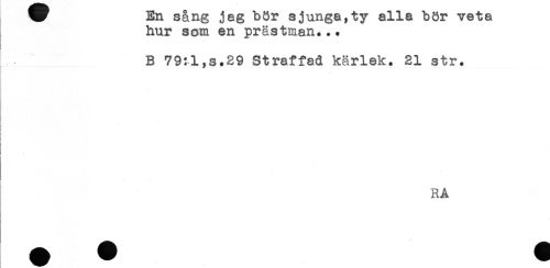 //// ^ ji;n sang jag oor sjunga, *cy ai.±a oor ve*ca //// hur som en prästman... //// B 79:1,s.29 Straffad kärlek. 21 str. //// RA ////