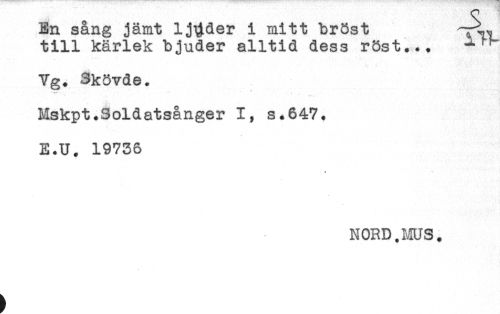 //// En sång jämt ljuder i mitt bröst -r^ //// till kärlek bjuder alltid dess röst... //// Vg. Skövde. //// - //// ***' --- . //// - //// Mskpt.Soldatsånger I, s.647. //// E.U. 19736 //// * //// NORD. ms. //// t ////