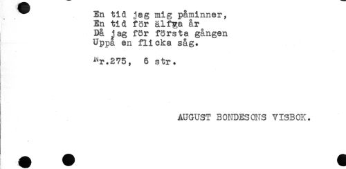 //// ^ En tid jag mig påminner. //// En tid för älfga år //// Då Jag för första gången //// Uppa en flicka såg. //// Rtr.275, 6 str. //// s //// ! //// AUGUST BONDESONS VISBOK. //// 1 T ////