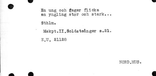 //// En ung och gager flicka //// en yngling stor och stark... //// 31 him. //// Mskpt.II.Soldatsånger s.21. //// E.U. 21128 //// _ ////