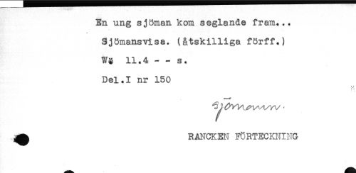 //// En ung sjöman kom seglande fram... //// Sjömansvisa. (åtskilliga förff.) //// W§ 11.4--s. //// Del.I nr 150 //// * 4 //// ^ RANCKEN FÖRTECKI?IN& ////