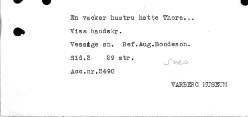//// En vacker hustru hette Thora... //// ** //// ! , Visa handskr. //// Vess&ge sn. Ref.Aug.Bondeson. //// Sid.3 29 str. //// ; Acc.nr.3490 //// i //// t //// VAREERG MUSEUM //// * //// t ////