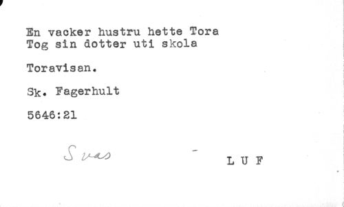 //// En vacker hustru hette Tora //// Tog sin dotter uti skola //// Toravisan. ! //// Sk. Fagerhult //// 5646:21 //// t //// ; //// L U F ////