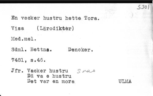 //// En vacker hustru hette Tora. * //// < //// Visa (Lärodikter) //// Med.mel. //// I //// Sdml. Bettna. Dencker. //// 7481, s.4S. //// Jfr. Vacker hustru //// Dä va e hustru //// Det var en mora ULMA ////