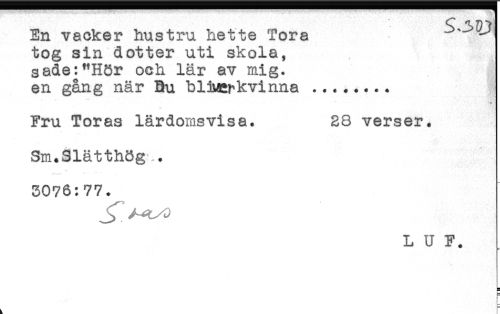 //// En vacker hustru hette Tora ^ //// tog sin dotter uti skola, //// sade:"Hör och lär av mig. //// en gång när Bu bUMSt^kvinna ... //// ! //// i //// Fru Toras lärdomsvisa. 28 verser. //// Sm.Slätthög . //// 5076:77. //// L U F. ////