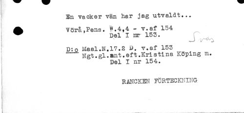 //// En vacker vän har jag utvaldt... //// ^ Vörå.Pens. ^.4,4 - v.af 154 //// ^ Del I nr 153. //// D:o Maal.N.17.2 D. v.af 155 //// - Ngt.gl.ant.eft .Kristina Köping m. //// ! Del I nr 154. //// RANCKEN FÖRTECKNING //// V ////