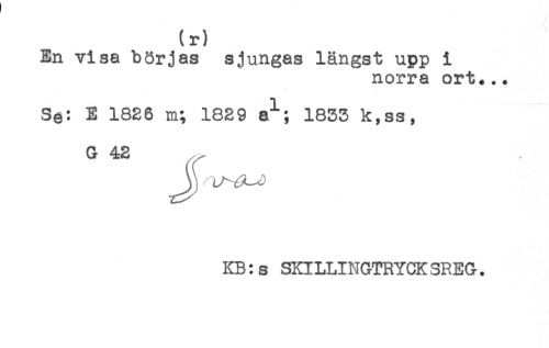 //// (r) //// En visa börjas sjungas längst upp i //// norra ort... //// Se: E 1826 m; 1829 a"**; 1833 k,ss, //// G 42 //// KB: s SKILLINGTRYCK SREG. ////