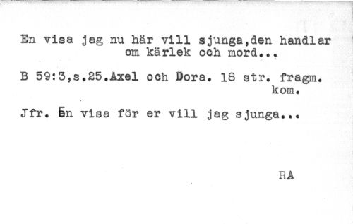 //// En visa jag nu här vill sjunga,den handlar //// om kärlek och mord... //// * //// B 59:3,s.25.Axel och Dora. 18 str. fragm. //// kom. //// Jfr. Én visa för er vill jag sjunga... //// RA ////