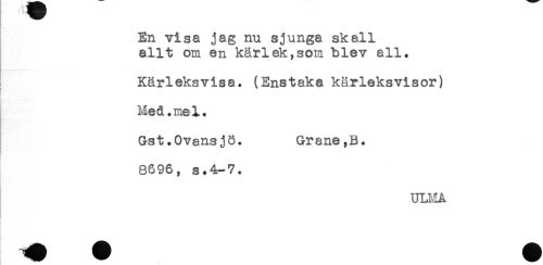 //// En visa jag nu sjunga skall //// allt om en kärlek,som blev all. //// Kärleksvisa. (Enstaka kärleksvisor) //// [ //// Med.mel. //// Gst.Ovans j ö. Grane,B. //// T * //// 8696, s.4-7. //// ULMA //// Hy ////