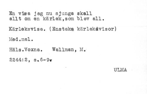//// En vls-a jag nu sjunga skall //// allt om en kärl ek, som blev all. //// Kärleksvisa. (Enstaka kärlekåvisor) //// Med.mel. //// Häls.Voxna. Wallman, M. //// 2244:2, s.6-9* //// ULMA ////