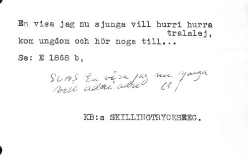//// En visa jag nu sjunga vill hurri hurra //// tralalej, //// kom ungdom och hör noga till... //// Se: E 1868 b, //// KB:s SKILLINGTRYCKSBEG. ////