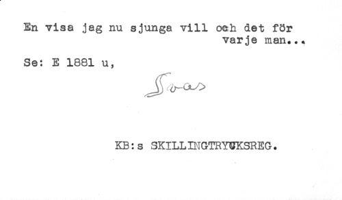 //// En visa jag nu sjunga vill oeh det för //// varje man... //// Se: E 1881 u, //// KB:s SKILLINGTRYPKSREG. ////