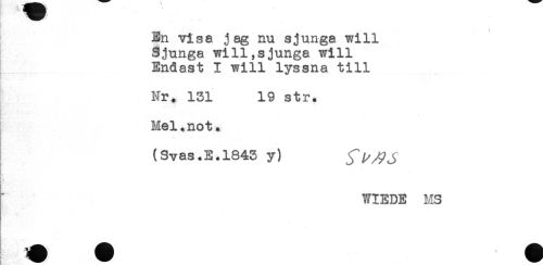 //// s * ... , //// En visa jag nu sjunga will //// Sjunga will,sjunga will //// Endast I will lyssna till //// t*. //// Nr. 131 19 str. //// Mel.not. //// (Svas.E.1843 y) //// h * - //// WIEDE MS //// * * a ////