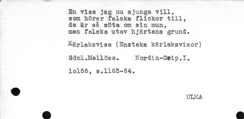 //// En visa jag nu sjunga vill, //// som hörer falska flickor till, //// de är så söta om sin mun, //// men falska utav hjärtans grund. //// Kärleksvisa (Enstaka kärleksvisor) //// - - . .. ,. ... - //// Sdml .Mellös a. Nordin-GBip,I. //// I0I66, s.1163-64. //// ^ ULI-.IA ////