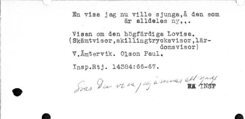 //// En visa jag nu ville sjunga,å den som //// är alldeles ny,,. //// Visan om den högfärdiga Lovisa. //// (Skämtvisor,skillingtrycksvisor,lär- //// ) " domsvisor) //// V.Åmtervik. Olson Paul. //// Insp.Rtj. 14384:66-67. ////