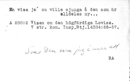 //// En visa ja^ nu ville sjunga å den som är //// alldeles ny... ] //// A 238:2 *Visan om den högfärdiga Lovisa. //// 7 str. kom. Insp.Rtj.14384:66-67. //// J^ ^^ ^^^ ' .......I //// RA //// ! //// s //// [ //// t //// t ////