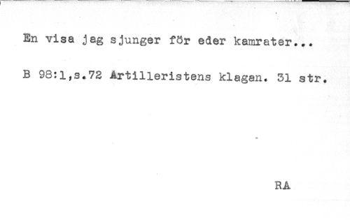 //// En visa jag sjunger för eder kamrater... //// B 98:i,s.72 Artilleristens klagan. 31 str. //// -fW //// RA ////