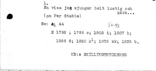 //// *** * //// En vise jag sjunger helt lustig och //// - , ^ . käck... //// ^ (om Per Stabbe) //// Se: Ai 44 ^ ^ //// E 1792 ; 1799 c; 1802 i; 1807 h; //// 1826 d; 1828 k^-; 1832 kk; 1836 b, //// KB:s SKILLINGTR YCKSREG //// C- ////