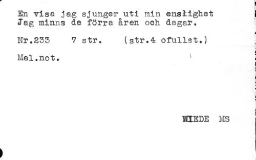 //// En visa jag sjunger uti min enslighet I //// Jag minns de förra åren och dagar. //// ** //// < //// Nr.235 7 str. (str.4 ofullst.) ^ //// a //// c //// Mel.not. ! //// < //// ! //// HIEDE MS ////