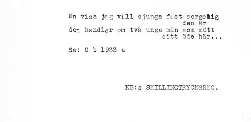 //// En visa jag vill sjunga fest sorge&lg //// den är //// den handlar om två unga män som mött //// sitt öde här... //// Se: O b 1933 a //// KB:s SXILLINGTRYCKSREG. ////