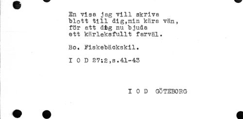 //// En visa jag vill skriva //// blott till dig,min kära vän, //// för att dig nu bjuda //// ett kärleksfullt farväl. //// Bo. fiskebäckskil. //// ' - //// IOD 27:2,s.41-43 //// t //// L //// IOD GÖTEBORG ////