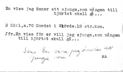 //// En visa jag ämnar att sjunga,som mången till //// hjärtat skall ^ ... //// T - //// B S5:l,s.70 Mordet i SMvde.18 str.kom. //// Jfr.En visa för er vill jag sjunga,som mången //// till hjärtat skall gå... ////
