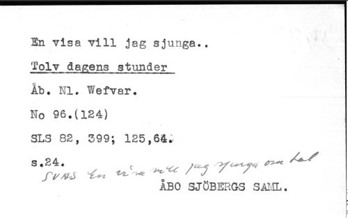 //// En visa vill jag sjunga.. //// * //// Tolv dagens stunder //// Åb. NI. Wefvar. //// No 96.(124) //// * //// SLS 82, 399; 125,64* //// s.24. , . ^ ^^ //// ÅBO SJÖBERGS SAHL. ////