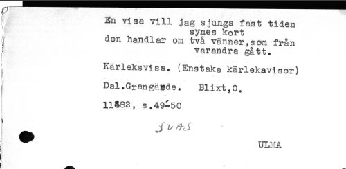 //// i En visa vill jag sjunga fast tiden //// : synes kort //// j den handlar om två vänner,som från //// ; varandra gått. //// { //// t //// Kärleksvisa. (Enstaka kärlekavisor) //// ** //// Dal.Grangägde. Blixt,0. //// 11S82, s.49-50 //// ULMA ////