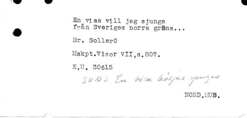 //// En^visa vill jag sjunga //// ^ från Sveriges norra gräns... //// Dr. Sollerö //// Mskpt.Visor VII,s.807. //// E.U. 30615 //// N0RD.I',IUS. //// '_____ ////