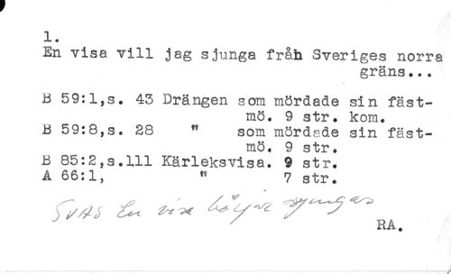 //// En visa vill jag sjunga fråh Sveriges norra //// gräns... //// B 59:l,s. 43 Drängen som mördade sin fäst- //// mö. 9 str. kom. //// B 59:8,s. 38 " som mördede sin fäst- //// mö. 9 str. //// B 85:2,s.111 Kärleksvisa. 9 str. //// A 66:1, " 7 str. //// RA. //// / J^ ////