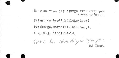 //// En visa vill jag sjunga fr&n Sveriges //// norra gräns... //// i - //// I (Visor om brott,kärleksvisor) //// Tystbeyga,Hornsvik. Källman,A. //// i Insp.Rt j. 11001:18-19. //// ^ HA INSP. ////