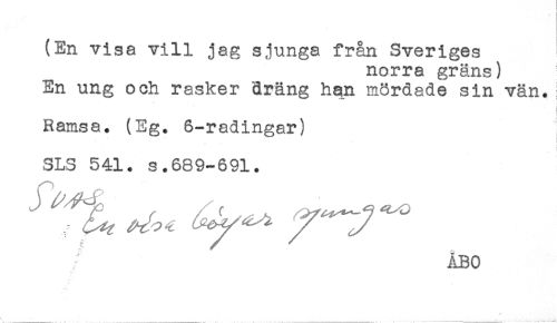 //// (En visa vill jag sjunga från Sveriges //// norra gräns) //// En ung och rasker dräng hon mördade sin vän.! //// Ramsa. (Eg. 6-radingar) //// SLS 541. s.689-691. ////