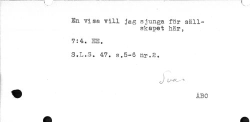 //// c . . . ^ //// En visa vill jag sjunga för säll- //// skapet här, //// r * //// t //// * //// 7:4. EE. //// S.L.S. 47. s.5-6 nr.S. //// J ' ////
