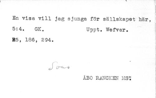 //// En visa vill jag sjunga för sällskapet här, //// 5:4. GK. Uppt. Wefvar. //// B5, 186, 394. //// t //// ! //// i //// J i //// I //// i //// ÅBO RANCKEN MS'J ////