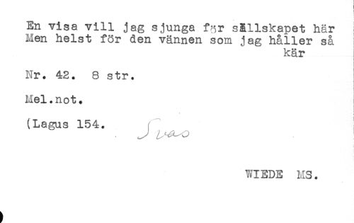 //// < //// ) //// En vise vill jag sjunga f-sr sällskapet här //// Men helst för den vännen som jag håller så //// kär //// Nr. 42. 8 str. //// Mel.not. //// (Lagus 154. //// jj //// WIEDE MS. ////