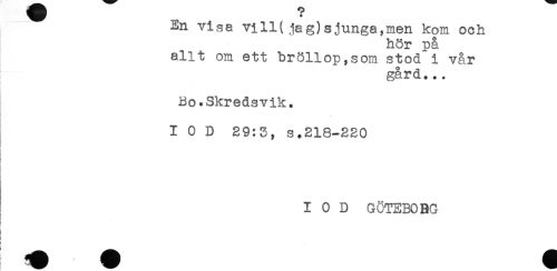 //// En visa vill(.jag)sjunga,men kom och //// hör på //// allt om ett bröllop,som stod i vår //// gård... //// Bo.Skredsvik. //// I 0 D 29:3, s.218-220 //// i //// i //// ! //// E //// ! //// I //// I 0 D GÖTEBORG //// < //// i //// i //// t * ////