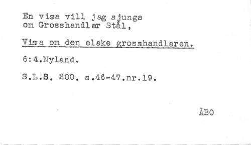 //// En visa vill jag sjunga //// om Grosshandlar Stal, //// Visa om den elake grosshandlaren. //// 6:4.Nyland. //// S.L.S. 200. s.46-47.nr.19. //// ÅBO ////